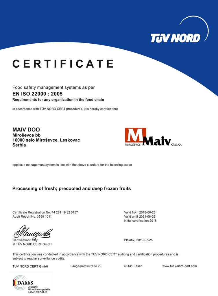 Standard ISO 22000:2005 obezbeđuje upravljanje bezbednošću proizvoda u svim fazama prerade dok je pod nadzorom firme Maiv i čini ga zdravim i kvalitetnim po korisnika.